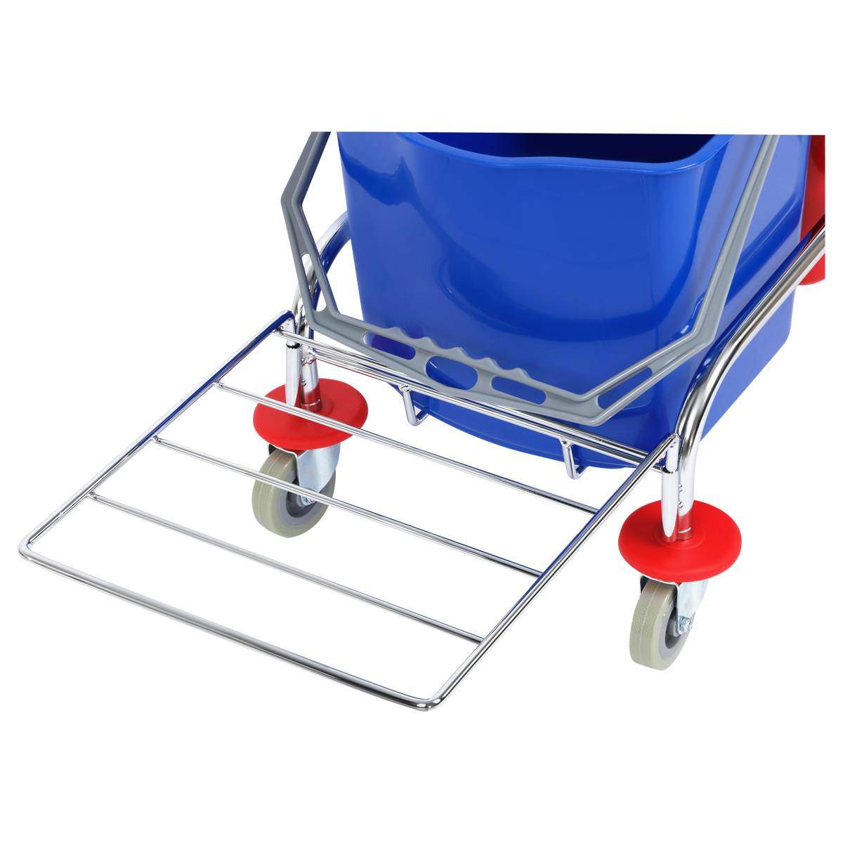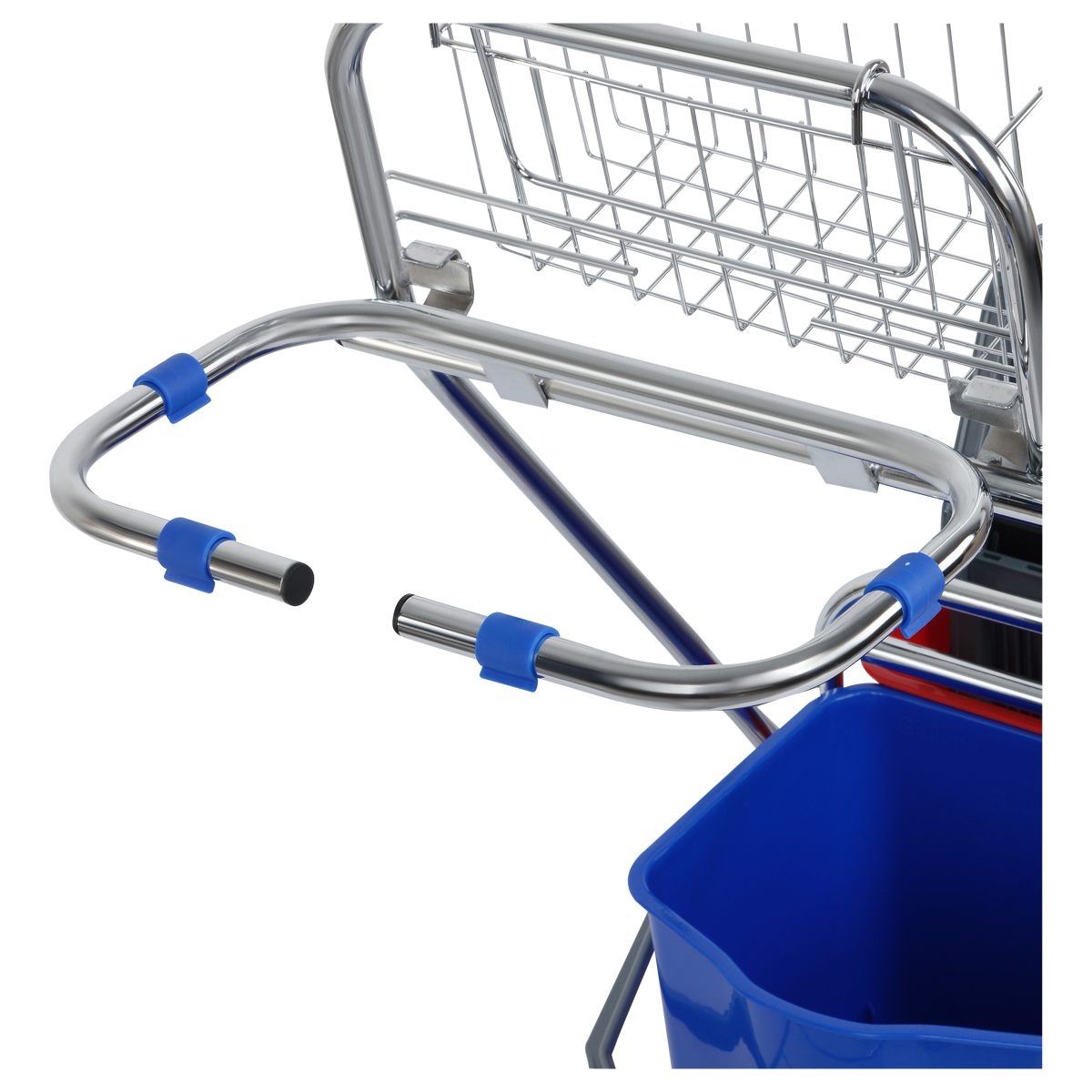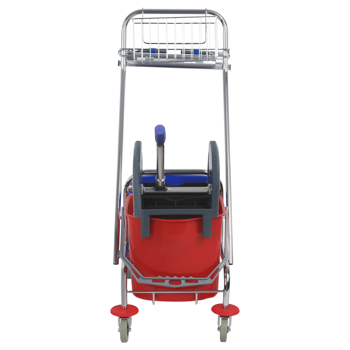 Тележка двухведерная с отжимом для петельных тряпов и МОПов, хромированный стальной каркас и перекидная ручка. Поворотные колеса с пластик.протекторами и бамперами. Два съемных ведра по 15л. с носиками для слива. Механический отжим для веревочных и плоских МОПов. Метал. сетка-лоток для хранения бытовой химии и других мелочей. Держатель для полиэтиленового мусорного мешка (мешок в комплект не входит). Для тележки подходят швабры: 265261 + 265262, 266773 и насадки 271110, 271107, 271108, 271109, 303275, 303089 в комплекте с рукоятками/черенками 303092 и 303272.