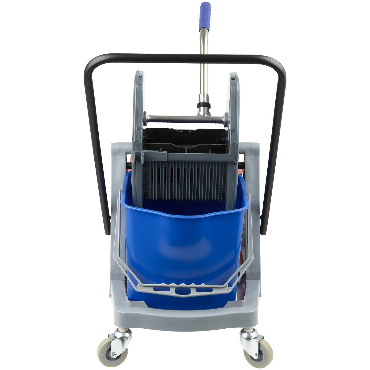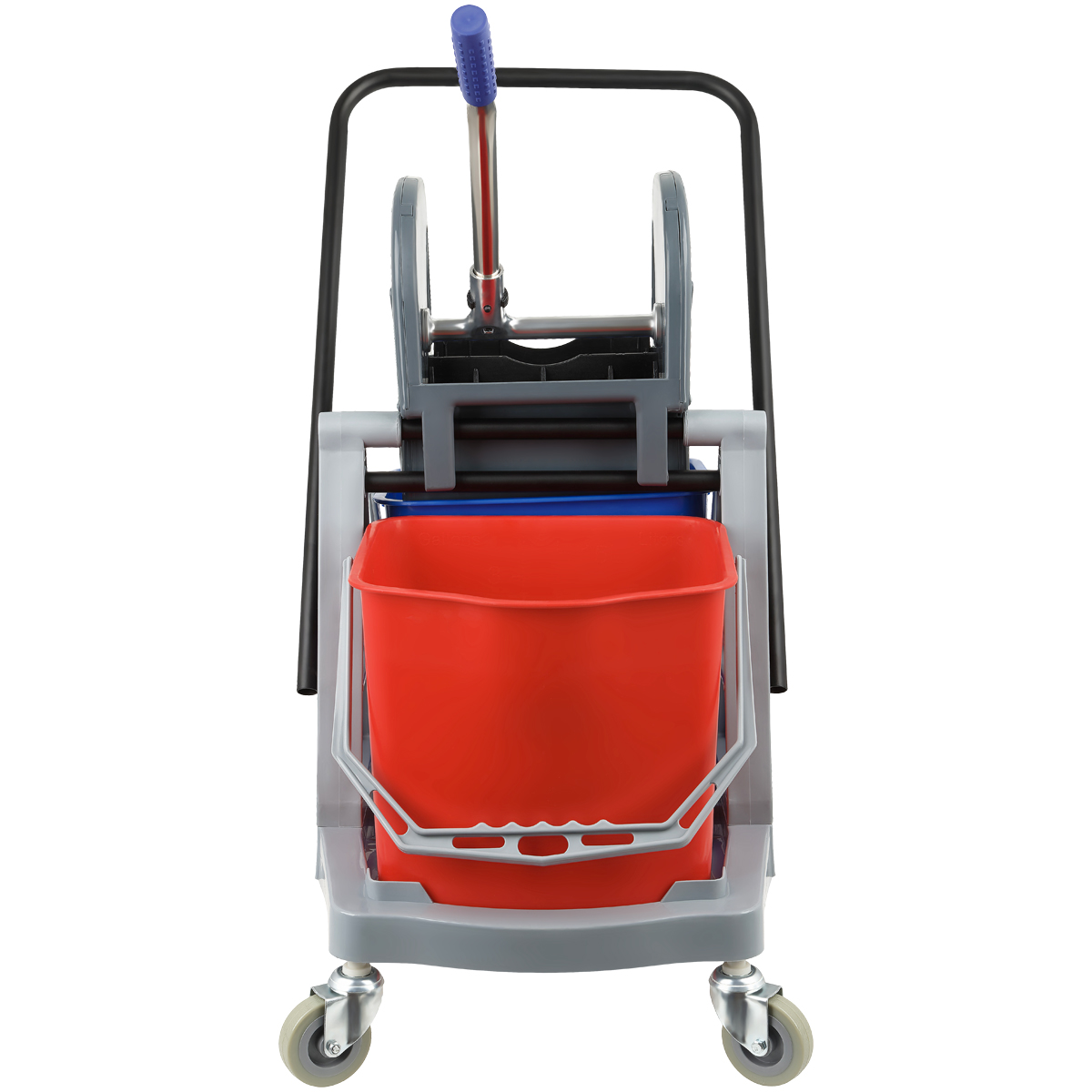Комплектация тележки: отжим, 2 ведра, транспортная ручка, каркас, 4 колеса.