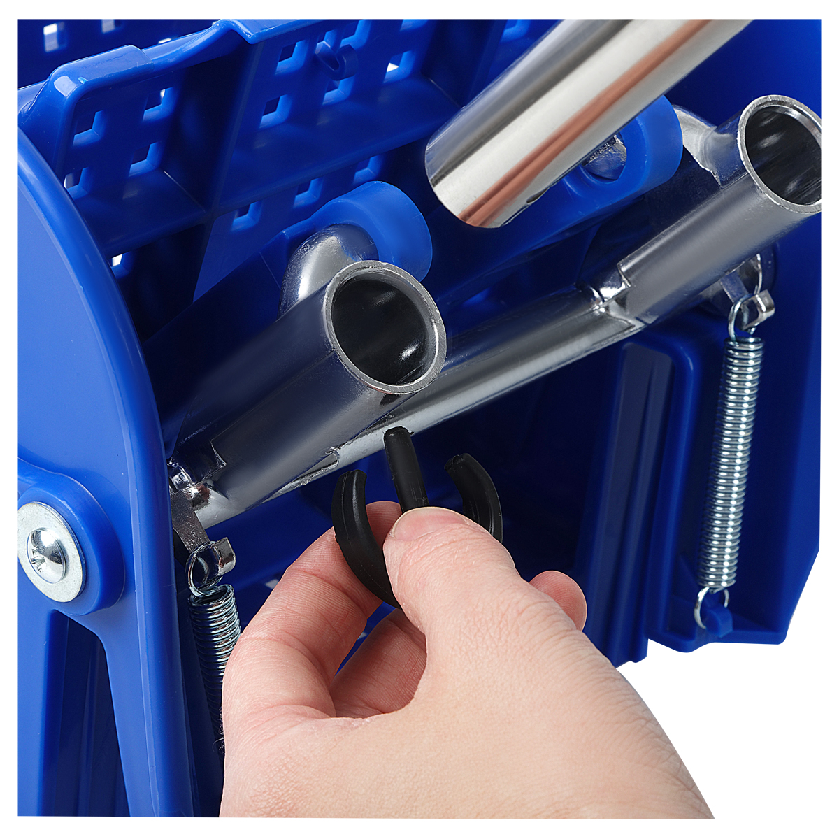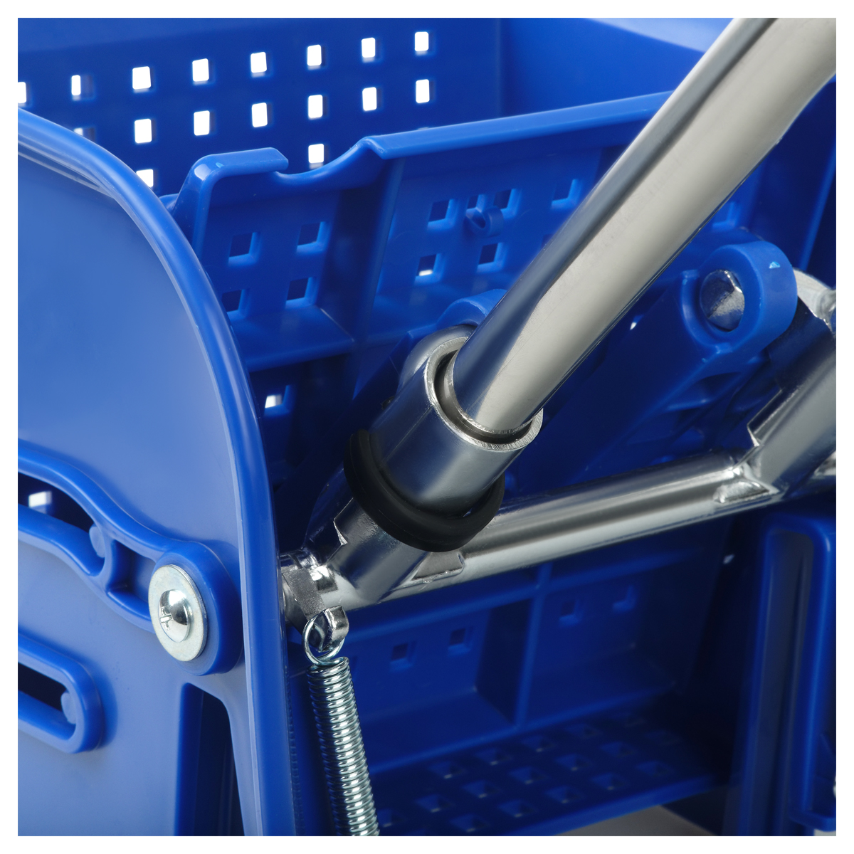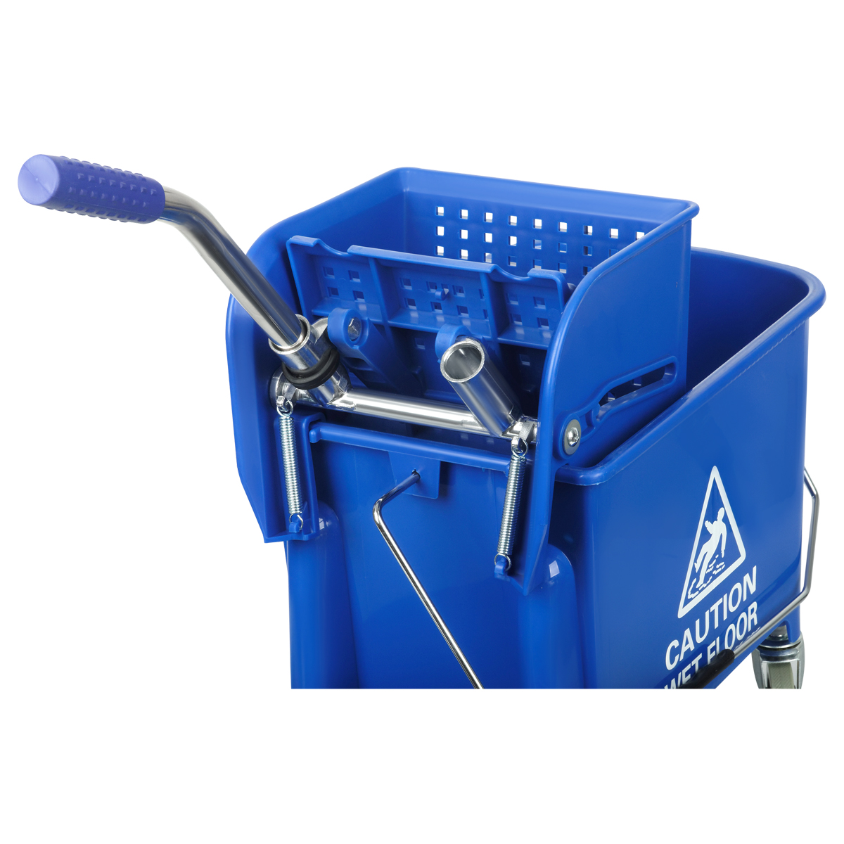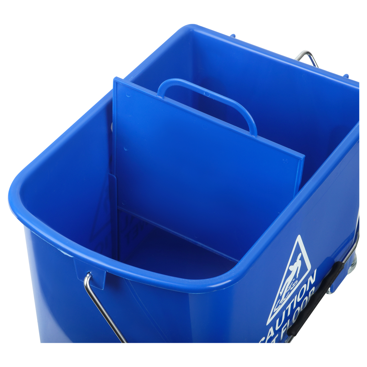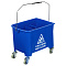 Ведро пластиковое, объем 20л, с перегородкой на 2 секции, перекидная метал. ручка, стальные поворотные колеса, механический отжим для петельных тряпок и МОПов. Для тележки подходят швабры: 265261 + 265262, 266773 и насадки 271110, 271107, 271108, 271109, 303275, 303089 в комплекте с рукоятками/черенками 303092 и 303272.