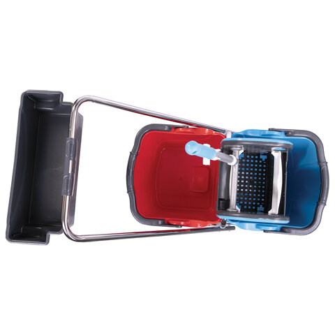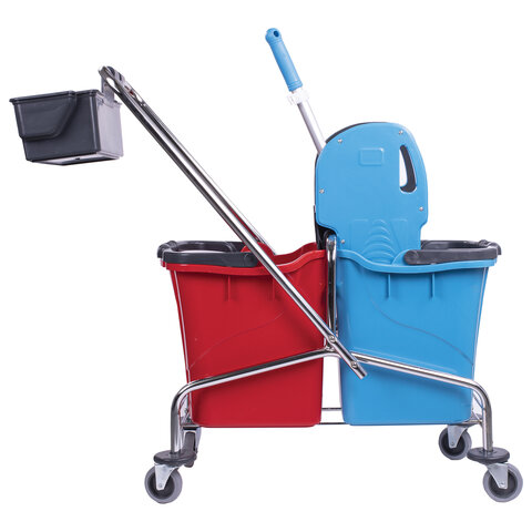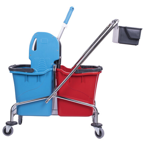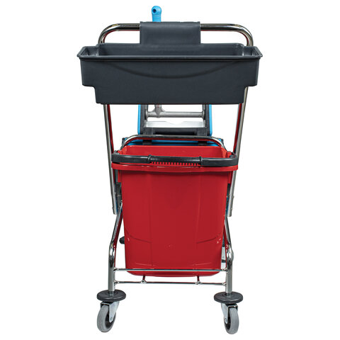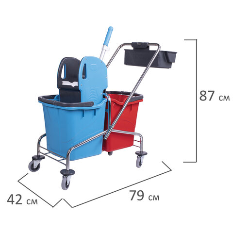 Представляет собой металлическую платформу на колесах с ведрами объемом 25 л каждое, механическим отжимом и корзинкой для бытовой химии на ручке. Корпус платформы изготовлен из хромированного металла, а инвентарь - из пластика. Тележка выполнена в трехцветном исполнении: красный, синий и серый. Колеса позволяют перемещаться в произвольном направлении.