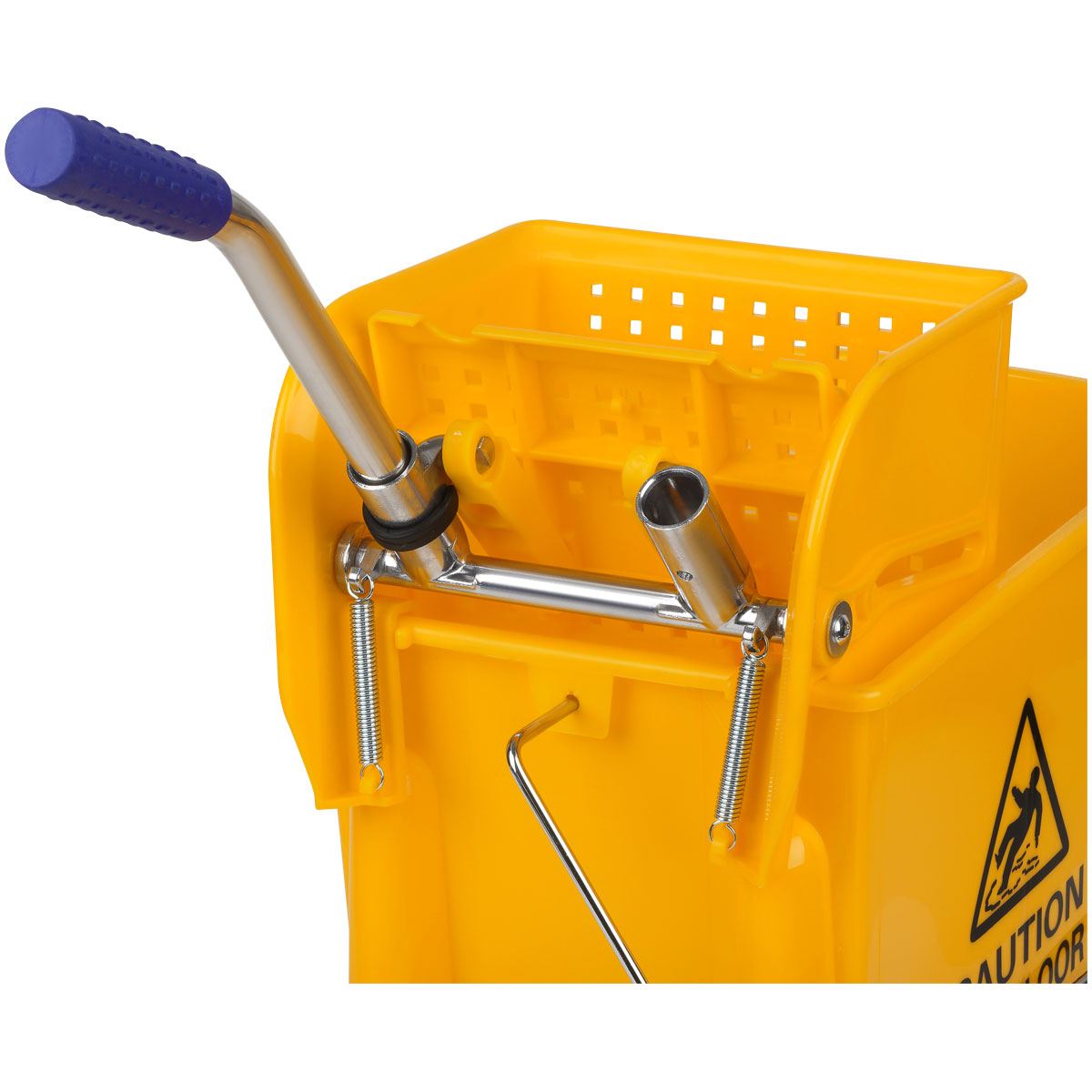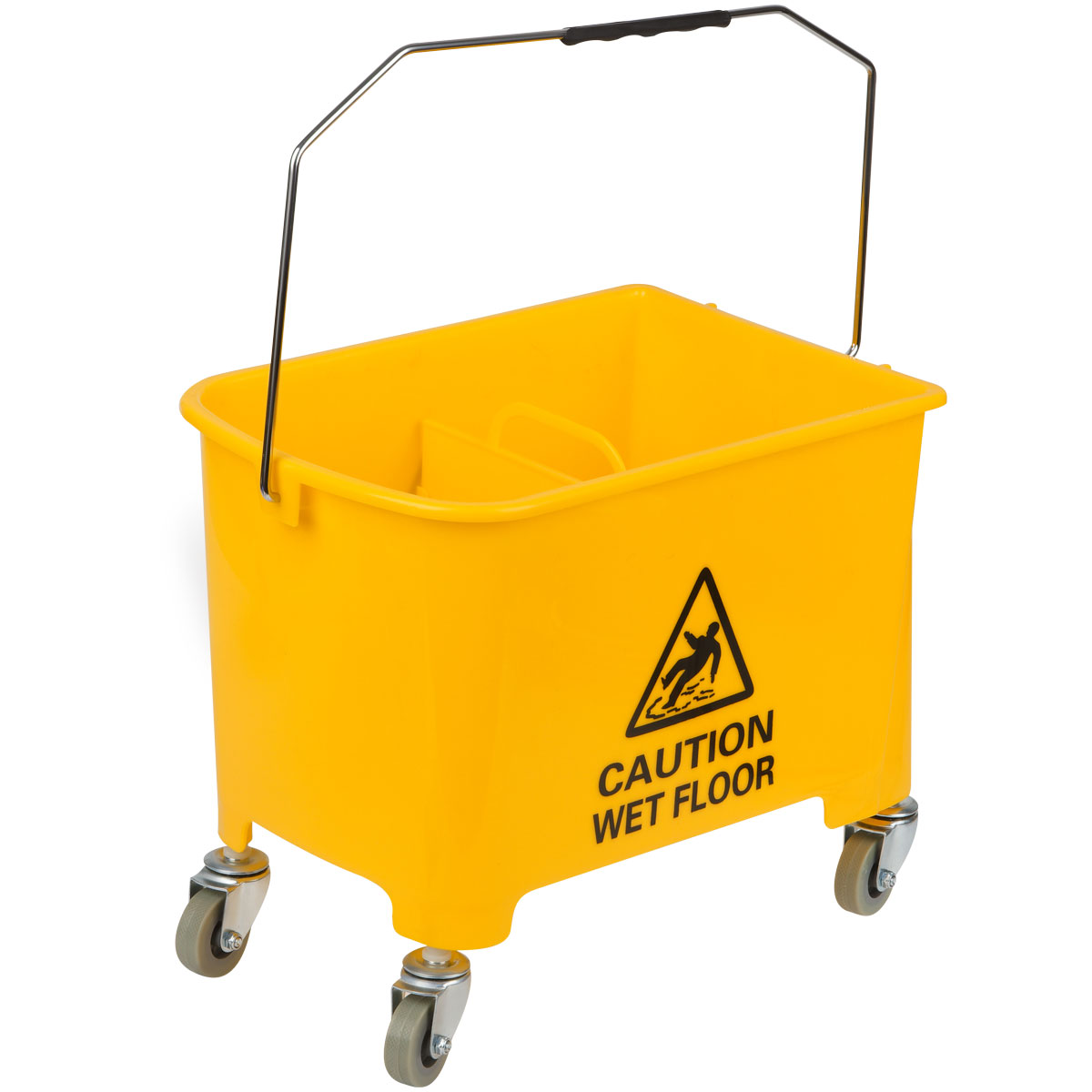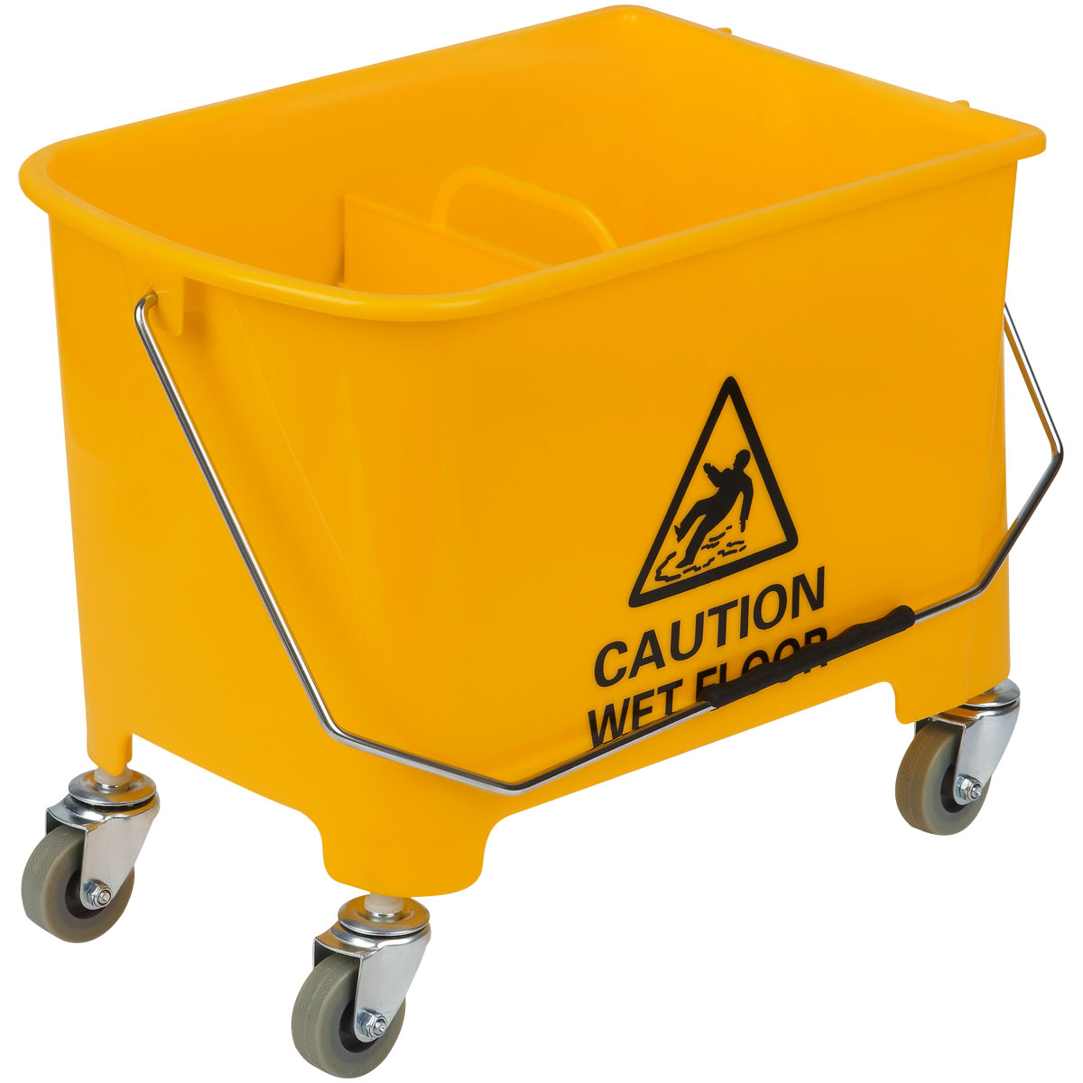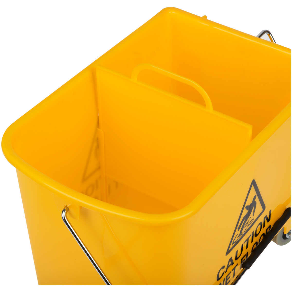Ведро пластиковое. Объем – 20 литров. С перегородкой на 2 секции, перекидная метал. ручка, стальные поворотные колеса, механический отжим для петельных тряпок и МОПов. Для тележки подходят швабры: 265261 + 265262, 266773 и насадки 271110, 271107, 271108, 271109, 303275, 303089 в комплекте с рукоятками/черенками 303092 и 303272.