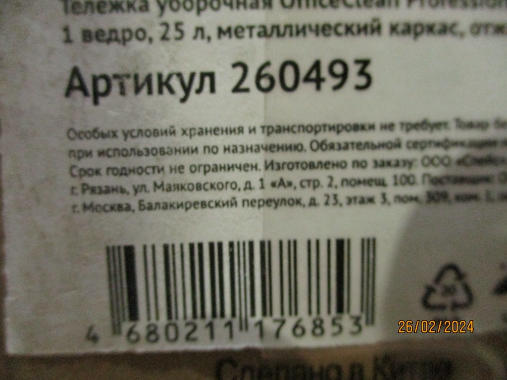 Тележка одноведерная имеет стальной каркас, стальные поворотные колеса с пластиковыми протекторами и защитными бамперами, съемное пластиковое ведро 25л с метал. ручкой и носиком для слива воды, механический отжим для петельных тряпок и МОПов, металлическая сетка-лоток для расходных материалов позади ведра.<br/><br/>Причина уценки: механические повреждения упаковки.