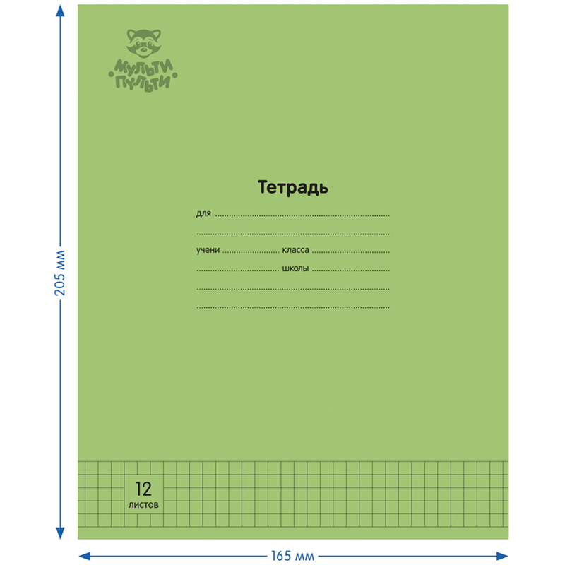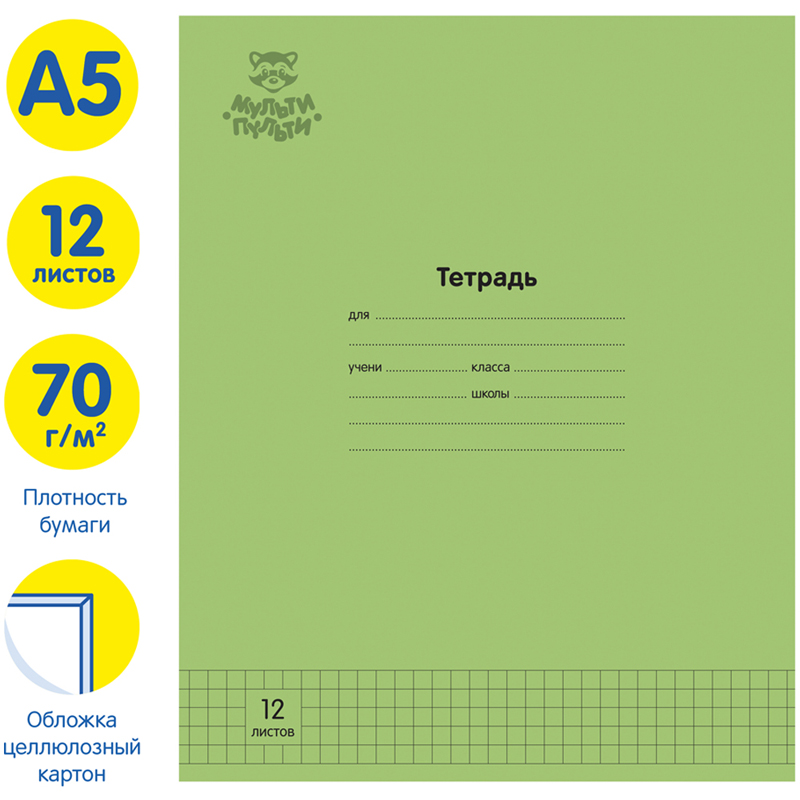 Тетрадь школьная «Мульти-Пульти» серия «Однотонная. Зеленая» формата А5 на скрепке состоит из 12 листов. Внутренний блок – это качественная офсетная бумага повышенной плотности 70 г/м2. Благодаря этому листы меньше подвержены просвечиванию и писать в такой тетради более приятно по сравнению со стандартной. белизна − 100%, линовка – клетка с полями. Обложка тетради изготовлена из качественного целлюлозного картона 190г/м2. Однотонные тетради подойдут для школьников любого года обучения.<br/>• Кол-во листов: 12;<br/>• Линовка: клетка с полями;<br/>• Белизна: 100%;<br/>• Плотность блока: 70 г/м2;<br/>• Крепление: скрепка;<br/>• Материал обложки: целлюлозный картон.