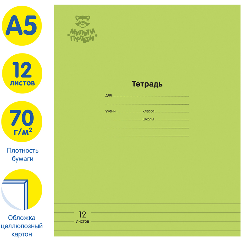 Тетрадь школьная «Мульти-Пульти» серия «Однотонная. Зеленая» формата А5 на скрепке состоит из 12 листов. Внутренний блок – это качественная офсетная бумага повышенной плотности 70 г/м2. Благодаря этому листы меньше подвержены просвечиванию и писать в такой тетради более приятно по сравнению со стандартной. белизна − 100%, линовка – линия с полями. Обложка тетради изготовлена из качественного целлюлозного картона 190г/м2. Однотонные тетради подойдут для школьников любого года обучения.