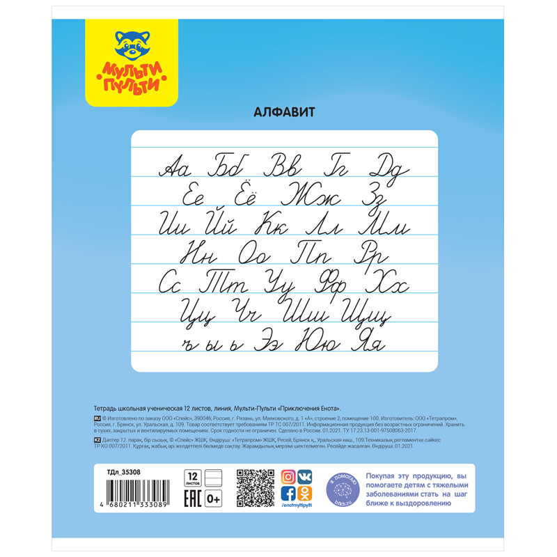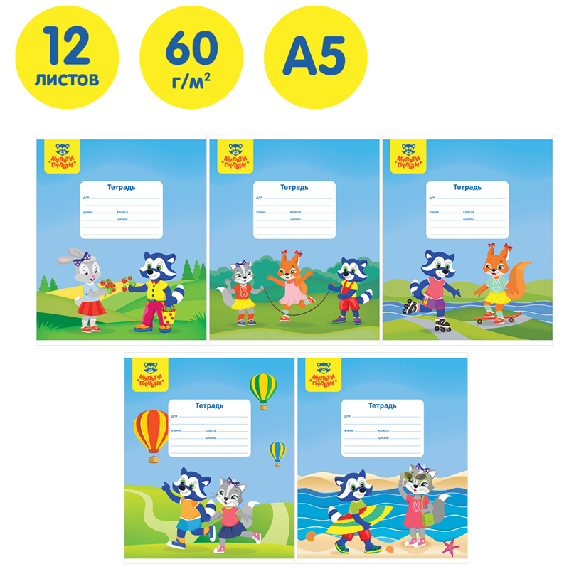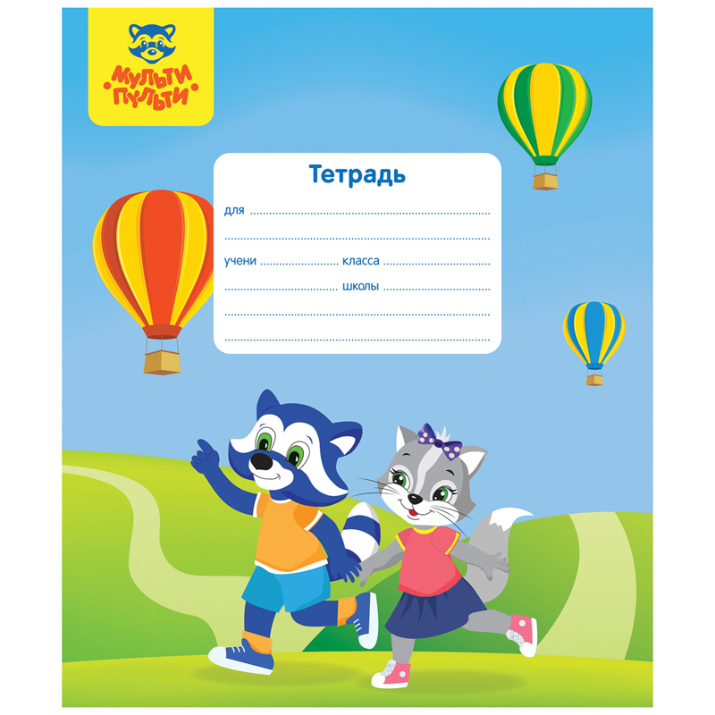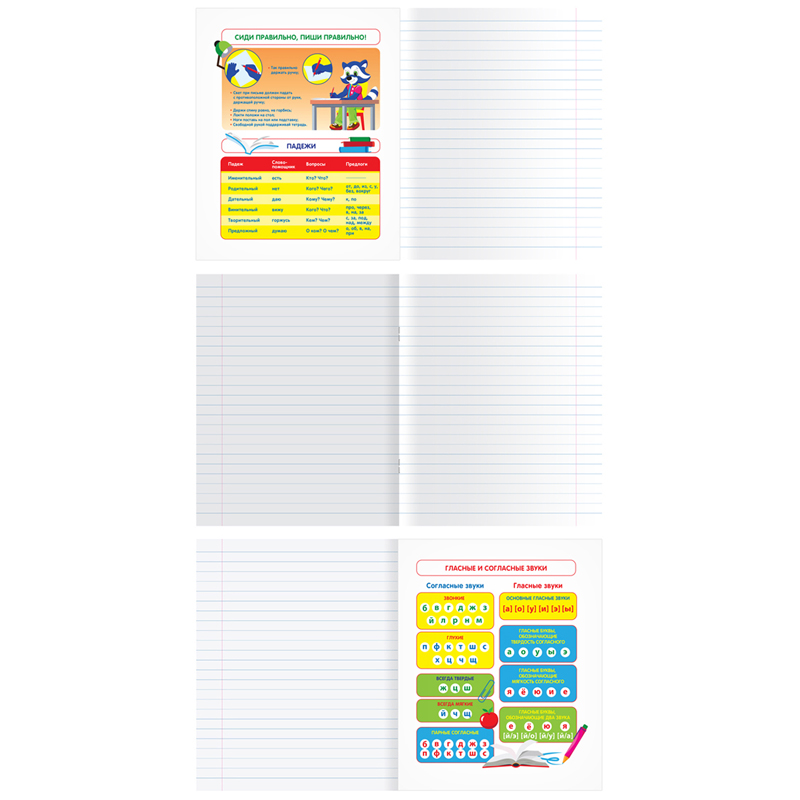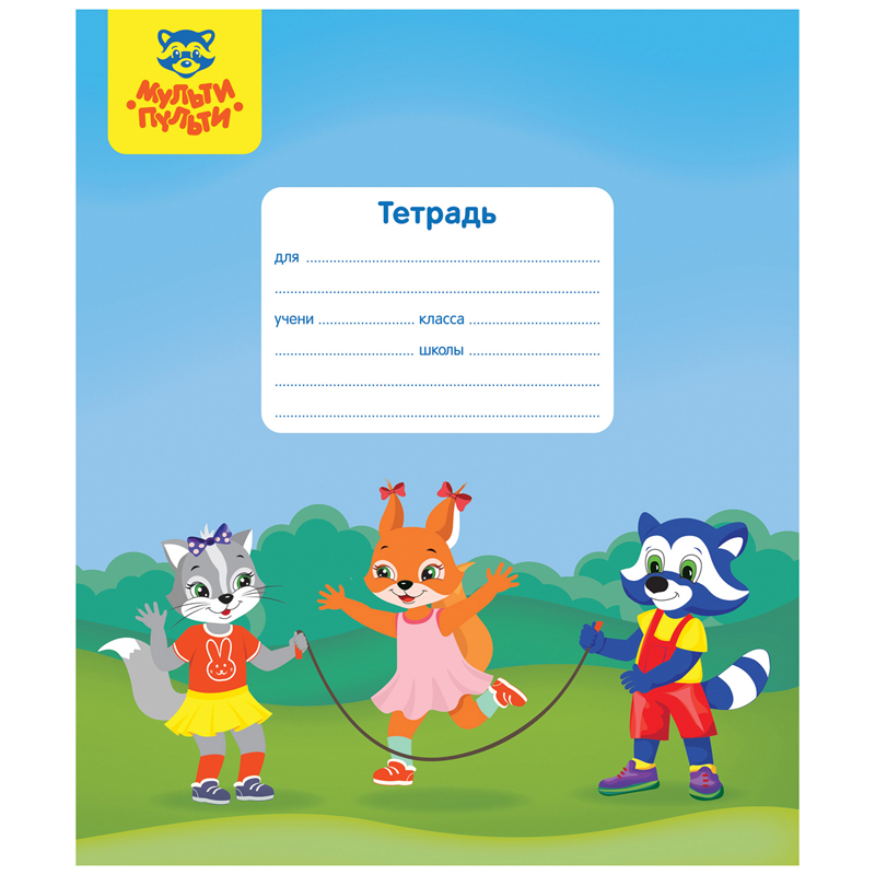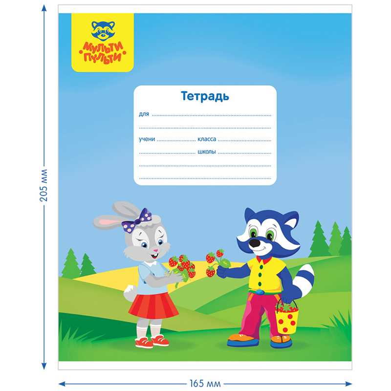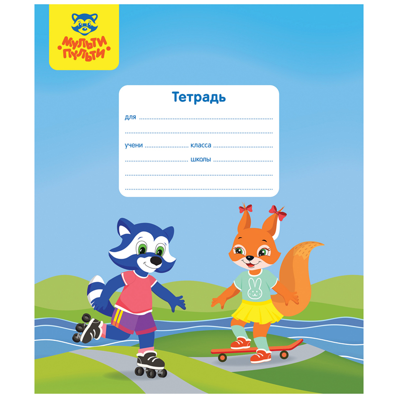 Тетрадь Мульти-Пульти имеет формат А5. Обложка выполнена из качественного импортного мелованного картона и покрыта ВД-лаком. Форзацы обложки содержат цветной справочно-обучающий материал - "Сиди правильно, пиши правильно", справочную информацию о падежах, гласных и согласных звуках. Внутренний блок – офсет 60-65 г/м², линовка - линия с полями. Объем блока – 12л.