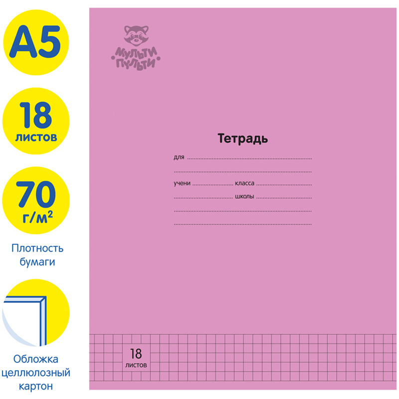 Тетрадь Мульти-Пульти однотонная в клетку. Внутренний блок из качественного офсета повышенной плотности 70г/м2. Благодаря этому листы меньше подвержены просвечиванию и писать в такой тетради более приятно по сравнению со стандартной. Обложка из качественного целлюлозного картона 190г/м2. Объем блока - 18л. Формат А5
