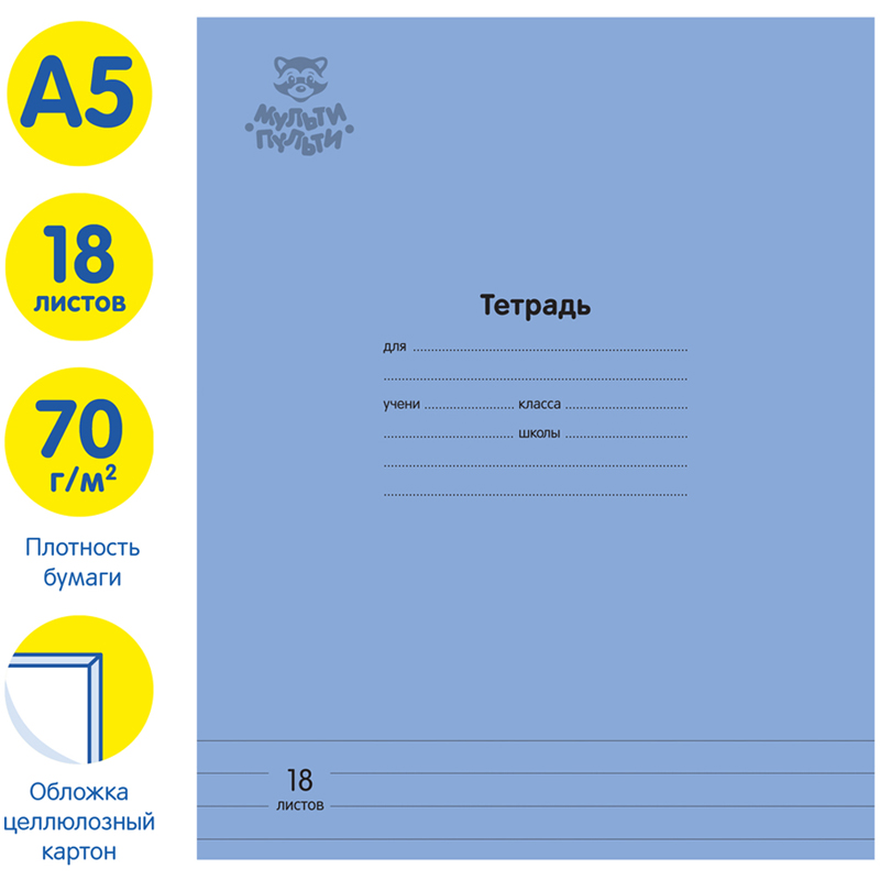 Тетрадь Мульти-Пульти однотонная в линию. Внутренний блок из качественного офсета повышенной плотности 70г/м2. Благодаря этому листы меньше подвержены просвечиванию и писать в такой тетради более приятно по сравнению со стандартной. Обложка из качественного целлюлозного картона 190г/м2. Объем блока - 18л. Формат А5