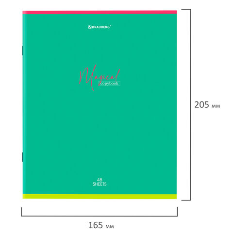 Внутренний блок содержит 48 листов офсетной бумаги плотностью 65 г/м2. Обложка изготовлена из мелованного картона. Линовка - линия с полями. Скрепка надежно скрепляет листы между собой. Белизна - 100%. Формат А5.