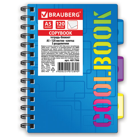 Обложка выполнена из цветного пластика с текстурой и сложной вырубкой. 3 удобных съемных разделителя помогут легко находить нужную информацию. Внутренний блок содержит 120 листов офсетной бумаги плотностью 65 г/м2 и белизной 100%. Линовка блока - в клетку. Листы соединены евроспиралью с левой стороны. Формат А5 (148х210 мм).