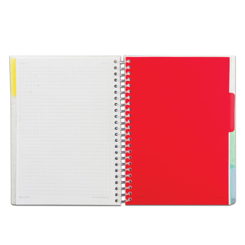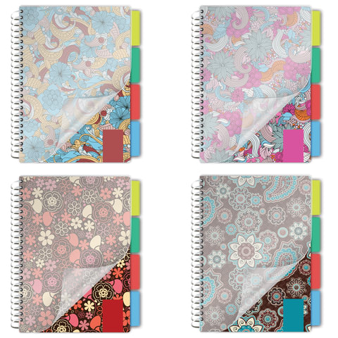 Пластиковая обложка надежно защитит внутренний блок от повреждений. Внутренний блок содержит 150 листов офсетной бумаги плотностью 65 г/м2 и белизной 100%. Линовка блока - в клетку. Тетрадь снабжена четырьмя пластиковыми, съемными разделителями. Листы соединены евроспиралью. Формат А5.