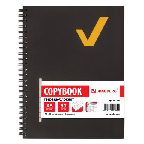 Пластиковая обложка надежно защитит внутренний блок от повреждений. Внутренний блок содержит 80 листов офсетной бумаги плотностью 65 г/м2 и белизной 100%. Линовка блока - в клетку. Тетрадь снабжена пластиковым, съемным разделителем. Листы соединены евроспиралью. Формат А5.
