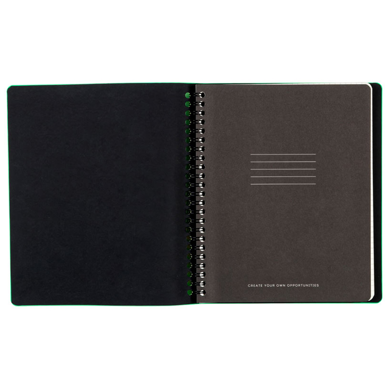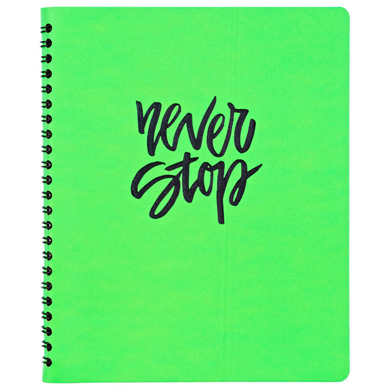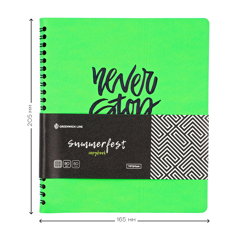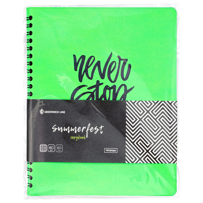 Мягкая тетрадь Greenwich Line из серии Summerfest в обложке из высококачественной экокожи яркого неонового лаймового цвета. Изделие формата А5 (165*205 мм), вид крепления – гребень. Внутренний блок с увеличенным объёмом 80 листов из белой бумаги плотностью 80 г/м². Линовка – клетка без полей.