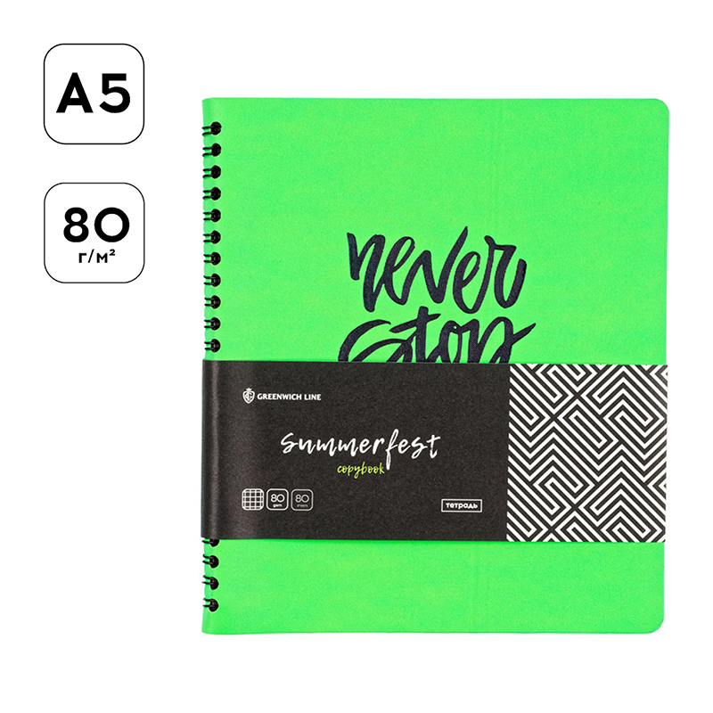 Мягкая тетрадь Greenwich Line из серии Summerfest в обложке из высококачественной экокожи яркого неонового лаймового цвета. Изделие формата А5 (165*205 мм), вид крепления – гребень. Внутренний блок с увеличенным объёмом 80 листов из белой бумаги плотностью 80 г/м². Линовка – клетка без полей. <br/>• Количество листов: 80;<br/>• Линовка: клетка без полей;<br/>• Формат: А5 (165*205 мм);<br/>• Плотность блока: 80 г/кв.м;<br/>• Крепление: гребень;<br/>• Материал обложки: экокожа.