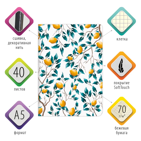 Общая тетрадь формата А5 содержит 40 листов с линовкой в клетку. Сшивка плотно соединяет листы. Обложка изготовлена из высококачественного импортного картона с двусторонней запечаткой, что придает тетради изысканный и неповторимый стиль. Специальное покрытие "SoftTouch" с повышенными тактильными свойствами придает обложке мягкий, бархатистый эффект. Внутренний блок - тонированная офсетная бумага цвета слоновой кости плотностью 70 г/м2.