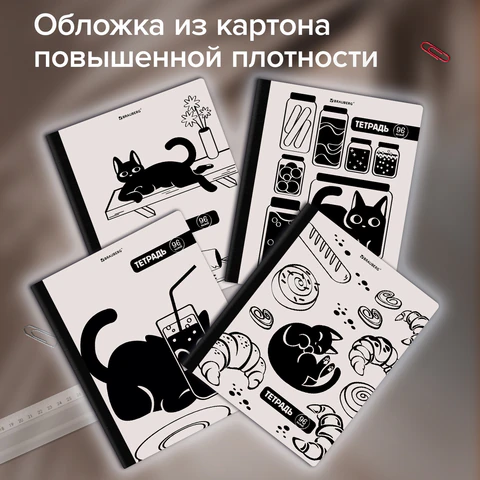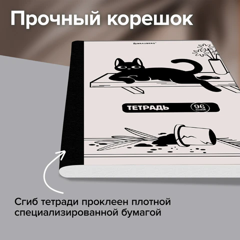Внутренний блок содержит 96 листов офсетной бумаги плотностью 60 г/м2. Обложка изготовлена из мелованного картона с матовой ламинацией. Линовка – клетка в рамке. Сшивка надежно соединяет листы между собой. Корешок тетради проклеен плотным материалом, дополняющим дизайн. Белизна блока – 100%. Формат листов - А5.