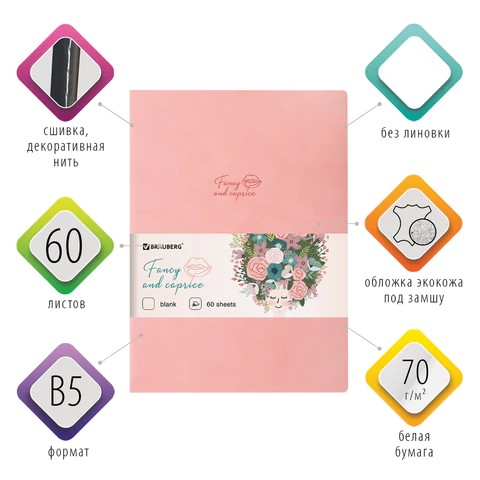 Общая тетрадь формата В5 содержит 60 листов без линовки, что позволяет не только писать, но и делать зарисовки и наброски карандашом, линером, ручкой. Сшивка плотно соединяет листы. Обложка изготовлена из высококачественной экокожи под замшу, что придает тетради изысканный и неповторимый стиль. Внутренний блок - белая офсетная бумага плотностью 70 г/м2.