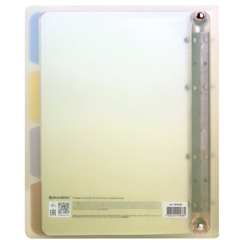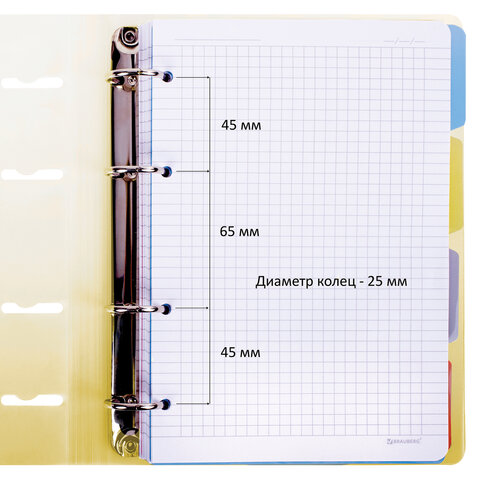 Тетрадь состоит из 120 листов офсетной бумаги плотностью 70 г/м2 с линовкой в клетку. Формат А5 является стандартным и обеспечивает комфортное ношение в рюкзаке/ранце или сумке. Кольцевой механизм позволяет легко сменить внутренний блок на новый, не покупая при этом новую тетрадь. Диаметр колец составляет 25 мм. Одна такая тетрадь способна заменить несколько небольших тетрадей для разного рода информации. Для удобства ведения записей тетрадь снабжена разделителями.