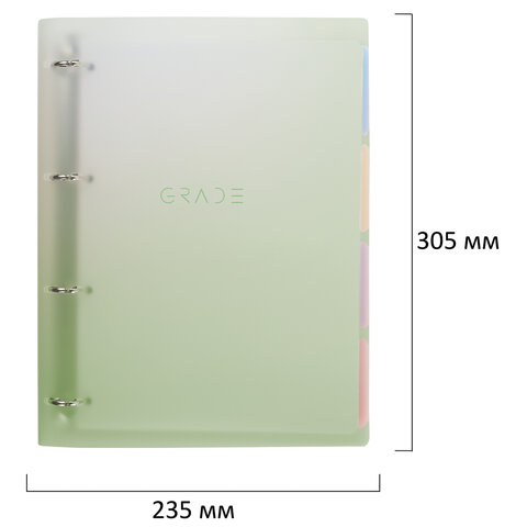 Тетрадь состоит из 120 листов офсетной бумаги плотностью 70 г/м2 с линовкой в клетку. Увеличенный формат А4 предназначен для ведения большого объема записей. Кольцевой механизм позволяет легко сменить внутренний блок на новый, не покупая при этом новую тетрадь. Диаметр колец составляет 25 мм. Одна такая тетрадь способна заменить несколько небольших тетрадей для разного рода информации. Для удобства ведения записей тетрадь снабжена разделителями.
