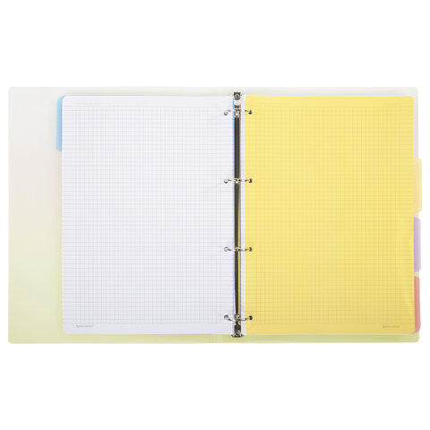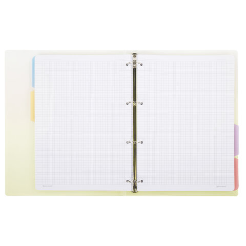 Тетрадь состоит из 120 листов офсетной бумаги плотностью 70 г/м2 с линовкой в клетку. Увеличенный формат А4 предназначен для ведения большого объема записей. Кольцевой механизм позволяет легко сменить внутренний блок на новый, не покупая при этом новую тетрадь. Диаметр колец составляет 25 мм. Одна такая тетрадь способна заменить несколько небольших тетрадей для разного рода информации. Для удобства ведения записей тетрадь снабжена разделителями.