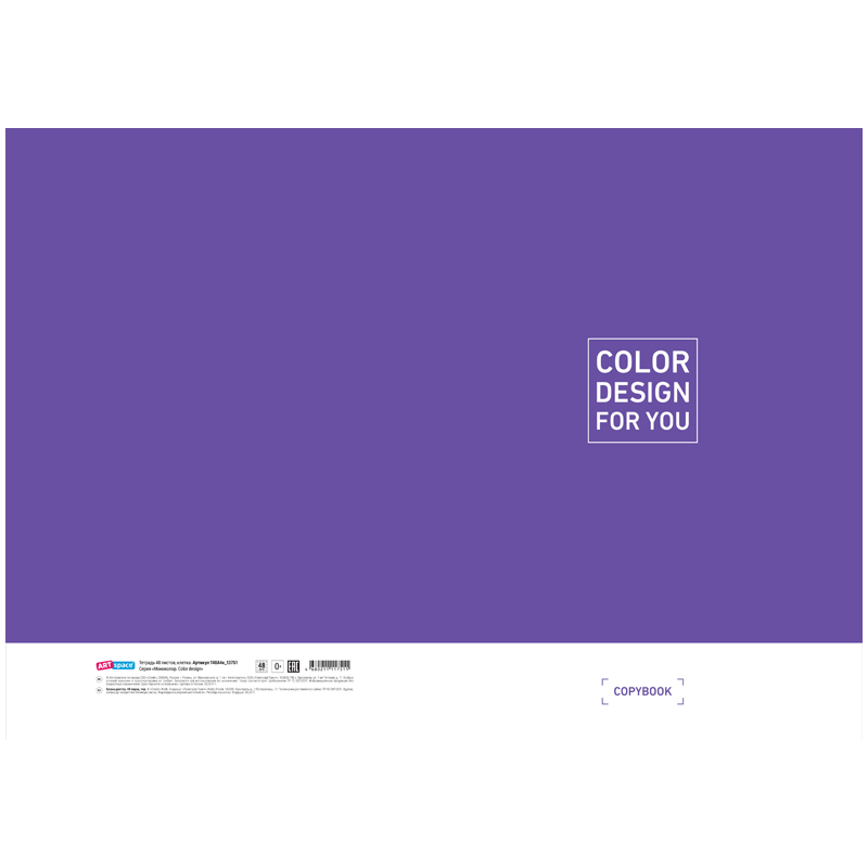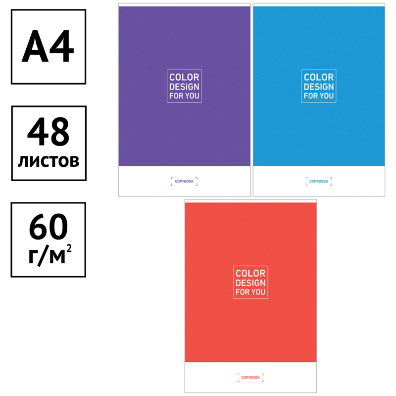 Тетрадь общая 48 л. на скобе, формата А4 (210*297 мм). Внутренний блок – офсет 60-65 г/м², белизна 100%, клетка. Обложка изготовлена из импортного целлюлозного мелованного картона, отделка обложки – водный лак.