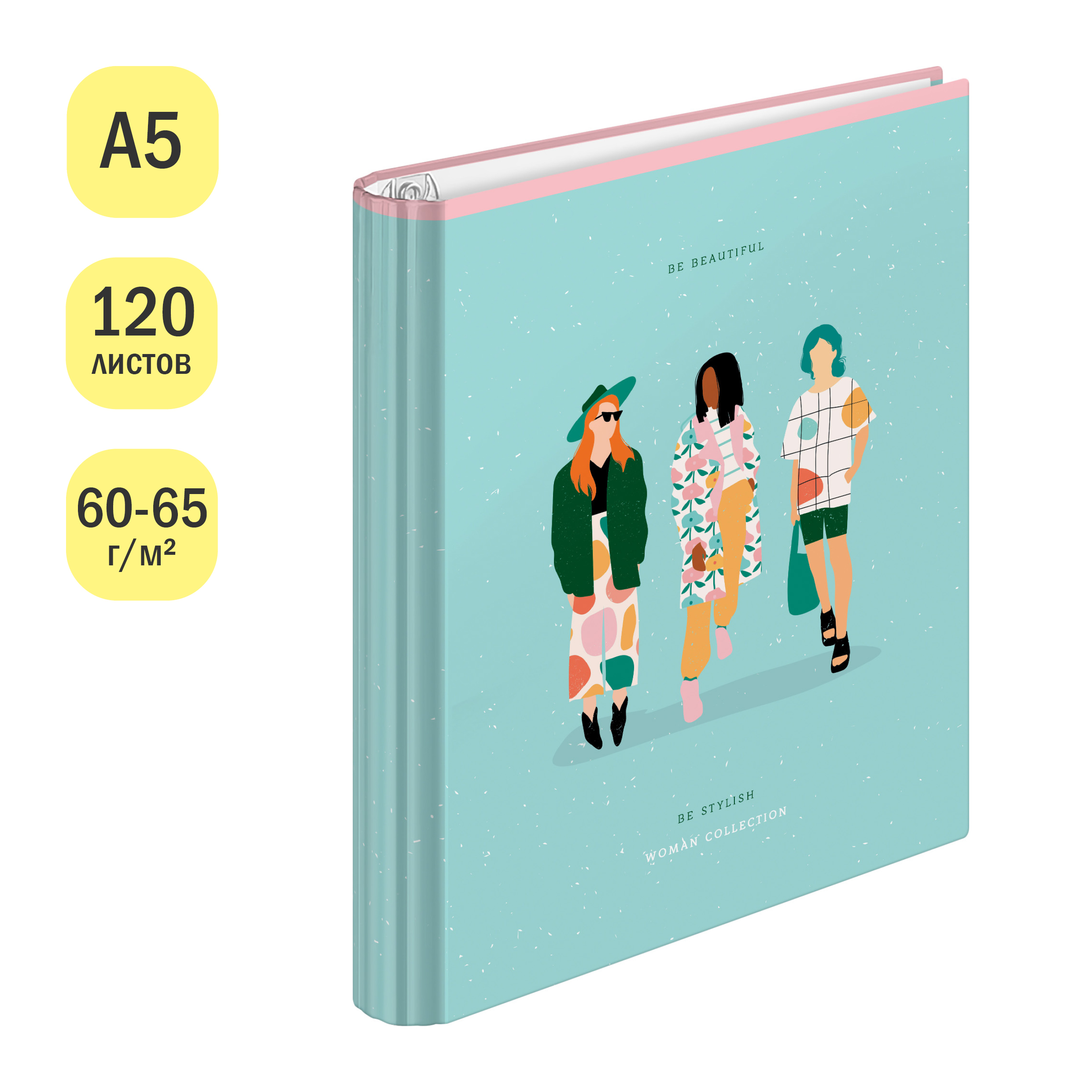 Тетрадь на кольцах ArtSpace серии «Стиль. Be beautiful» формата А5 (216*175 мм) – незаменимый помощник в офисе и учёбе и удобна для большого объёма записей. Внутренний блок – это 120 листов, офсетная бумага плотностью 60-65 г/м², белизна – 100%, линовка – клетка. Тетрадь имеет кольцевой механизм для быстрой смены или добавления листов, состоящий из 4 колец. Обложка изготовлена из твёрдого картона с матовой ламинацией и выборочным УФ-лаком, с скруглённым корешком. Упакована в термоусадочную плёнку.<br/>• Формат: А5 (216*175 мм);<br/>• Кол-во листов: 120;<br/>• Линовка: клетка;<br/>• Форма корешка: скруглённая;<br/>• Материал обложки: твёрдый картон.