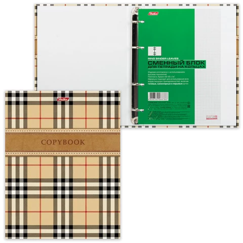 Блок состоит из 120 листов офсетной бумаги белого цвета плотностью 70 г/м2. Линовка – клетка с полями. Гибкая обложка из экокожи с вырубкой под кольца выполнена из износоустойчивого материала с текстурой под гладкую кожу. Увеличенный формат А4 предназначен для ведения большого объема записей. Кольцевой механизм позволяет легко сменить внутренний блок на новый, не покупая при этом новую тетрадь. Одна такая тетрадь способна заменить несколько небольших тетрадей для разного рода информации.