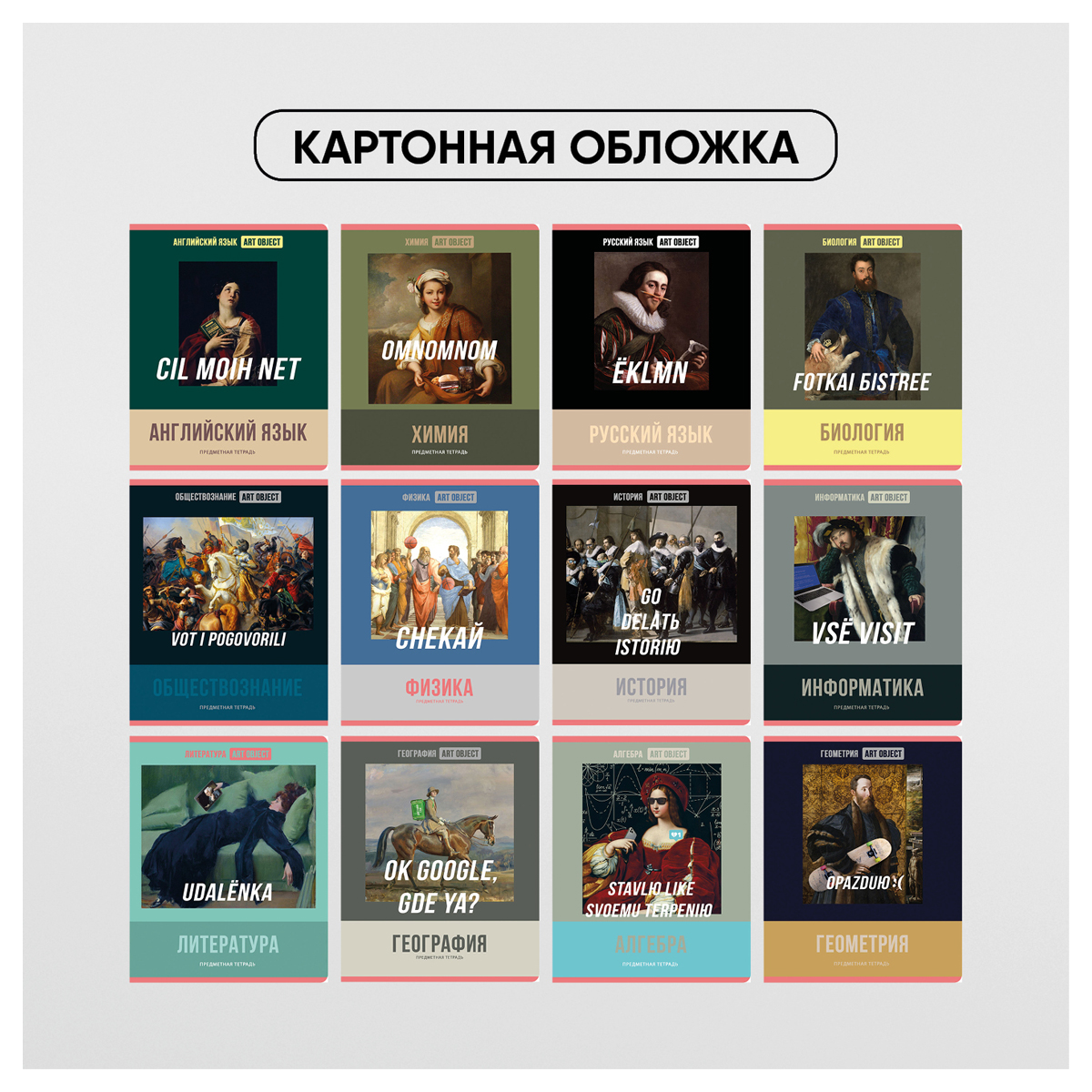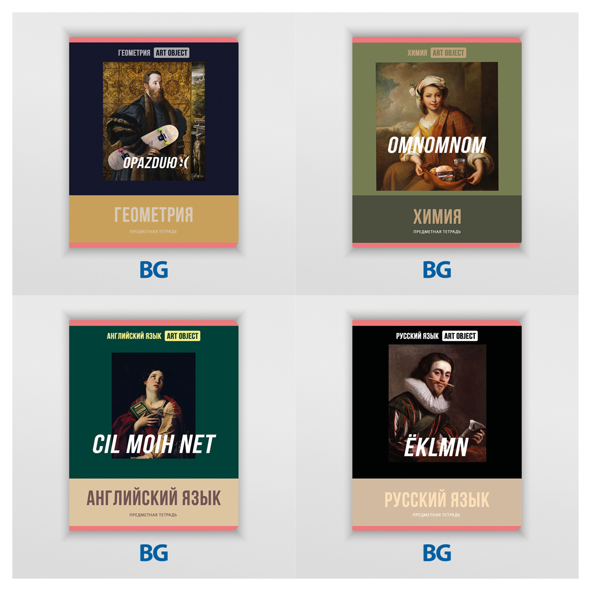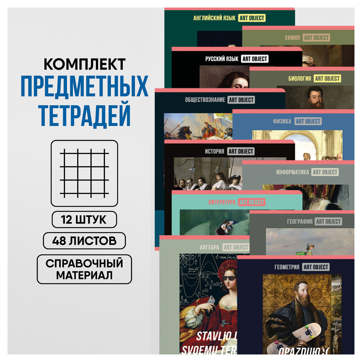 Комплект предметных тетрадей BG серии Art object со справочной информацией на дополнительных листах. В серии 12 предметов: алгебра, английский язык, биология, география, геометрия, информатика, история, литература, обществознание, русский язык, физика, химия. Формат тетради – А5, вид крепления – скрепка. Внутренний блок состоит из 48 листов офсетной бумаги плотностью 60 г/м2 и белизной блока 90-92%. Тип линовки – клетка или линия с полями. Обложка выполнена из мелованного картона c рисунком и имеет удобные скруглённые углы. Стильный и современный дизайн серии понравится ценителям искусства с чувством юмора. Комплект тетрадей упакован в термоплёнку с вкладышем.<br/>• Кол-во листов: 48;<br/>• Линовка (+поля): клетка/линия с полями;<br/>• Формат (и размер): А5;<br/>• Белизна: 90-92%;<br/>• Плотность блока: 60 г/м2;<br/>• Крепление: скрепка;<br/>• Количество тетрадей в комплекте: 12