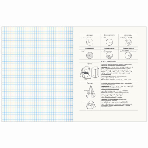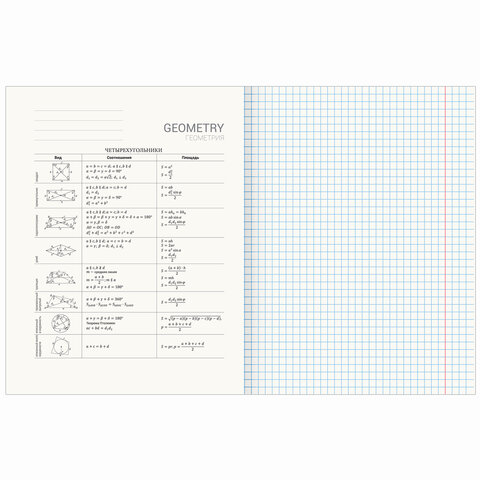 Тетрадь "Геометрия" формата А5 (165х202 мм) содержит 48 листов, изготовленных из высококачественной офсетной бумаги плотностью 60 г/м2 и белизной 100%. Листы соединены скобами. Линовка блока - в клетку, поля красные. Обложка выполнена из мелованного картона плотностью 190 г/м2 в тематике соответствующего предмета. Благодаря глянцевому лаку краски на изображении становятся более яркими и насыщенными. В справочном материале собраны основные подсказки по школьному предмету для учащихся.