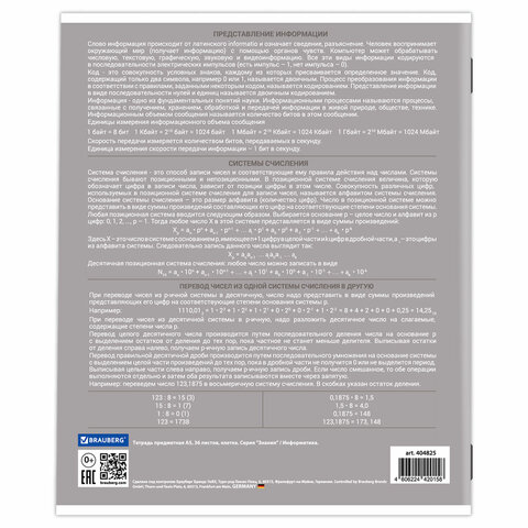 Тетрадь по информатике формата А5 (165х202 мм) содержит 36 листов, изготовленных из высококачественной офсетной бумаги плотностью 60 г/м2, 100% белизны. Листы соединены скобами. Линовка блока - клетка, красные поля. Обложка выполнена из мелованной бумаги плотностью 170 г/м2. На обратной стороне обложки расположены основные подсказки по школьному предмету.