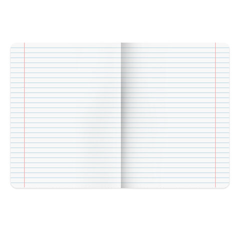 Тетради формата А5 содержат 48 листов, изготовленных из высококачественной офсетной бумаги 100% белизны и плотности 60 г/м2, с красными полями. Листы соединены скобами.