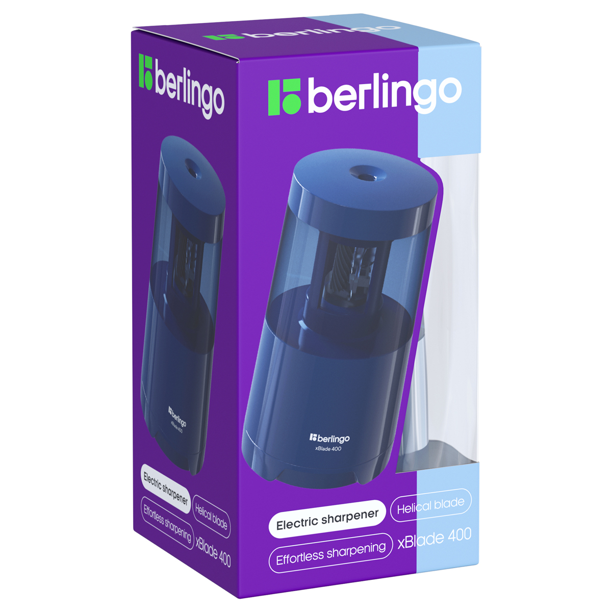 Уценка. Ограничений в дальнейшем использовании нет. Повреждения товара нет.<br/>Причина уценки: механические повреждения упаковки<br/><br/><br/>Точилка электрическая Berlingo xBlade 400 с контейнером и высококачественным фрезерным лезвием из инструментальной стали. Изделие предназначено для затачивания цветных и чернографитных карандашей диаметром 6-8 мм и имеет одно отверстие. Размер – 132*80*80 мм.<br/>Корпус синего цвета изготовлен из пластика. Прорезиненные захваты позволяют производить заточку без повреждения поверхности карандаша. Точилка оснащена антискользящими ножками. Питание осуществляется от 4 батареек АА (не поставляются в комплекте) или USB-кабеля, который поставляется вместе с точилкой. Есть возможность заменить лезвие (сменное лезвие Berlingo артикул производителя RBs_37005). Изделие упаковано в матовую картонную коробку. В комплекте инструкция. Гарантия 12 месяцев.<br/>• Материал корпуса: пластик;<br/>• Диаметр отверстия: 6-8 мм.<br/><br/>Уцененный товар подлежит возврату или обмену в случае обнаружения недостатков, о которых покупатель не был проинформирован перед покупкой