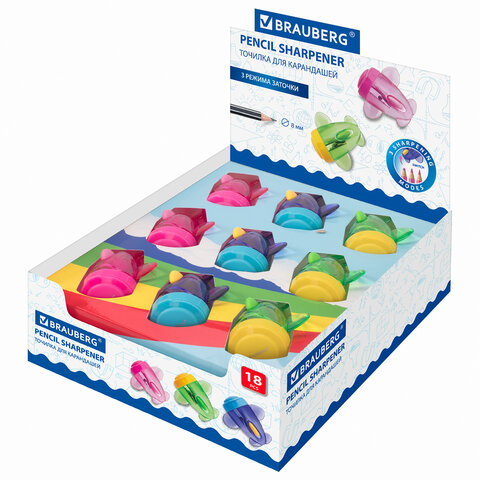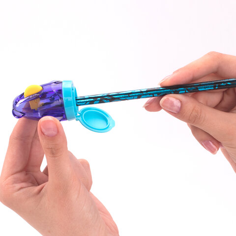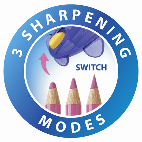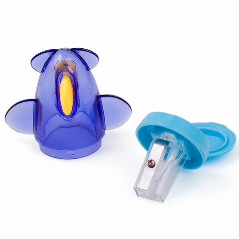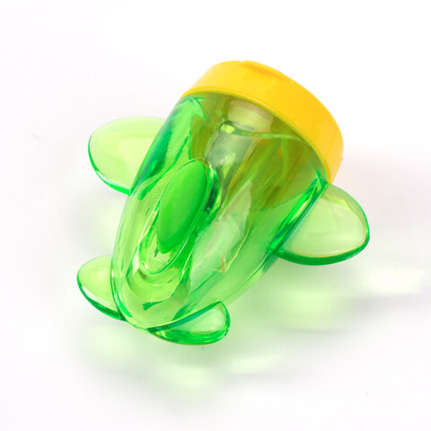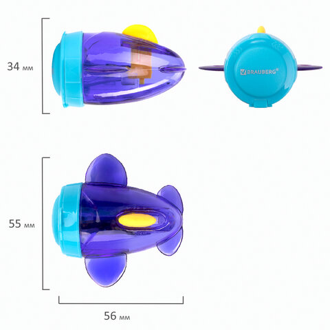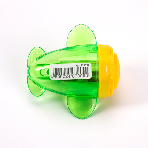 Эргономичный корпус в форме самолета выполнен из пластика ярких цветов ассорти. Острое стальное лезвие обеспечивает быструю и легкую заточку. Точилка оснащена переключателем режимов заточки, один для чернографитных, другой для цветных карандашей. Карандаши затачиваются аккуратно, а опилки остаются в специальном контейнере. Размер - 34х56х55 мм.