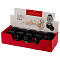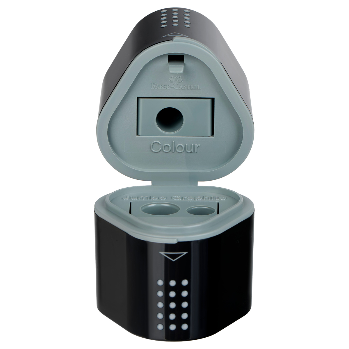 Точилка пластиковая Trio Grip 2001 легендарного немецкого производителя Faber-Castell в узнаваемом запатентованном дизайне Grip и классическом черном цвете уникальна тем, что имеет 3 отверстия для затачивания карандашей разной формы и назначения – для чернографитных карандашей стандартного размера, для цветных карандашей стандартного размера и цвеличенных карандашей Jumbo. Точилка снабжена двумя объемными плотно закрывающимися контейнерами для сбора стружек. Лезвия изготовлены из высококачественной стали с идеальной заточкой, сделаны в Германии. Точилка имеет предохранительные винты, что обеспечивает безопасность эксплуатации.