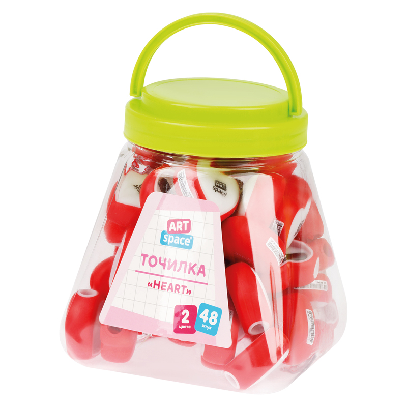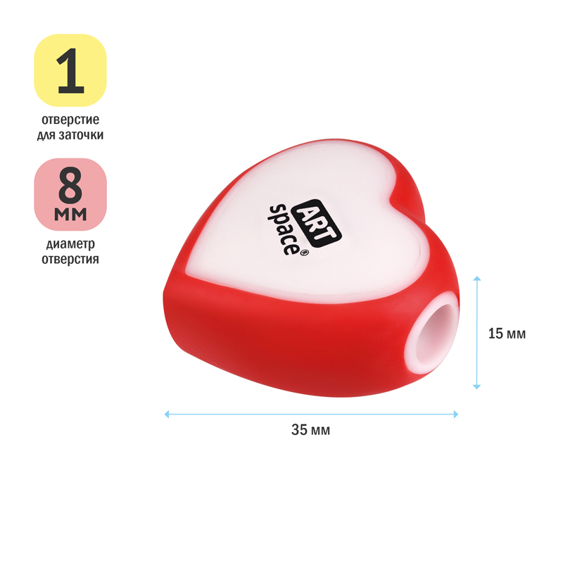 Точилка пластиковая ArtSpace Heart отлично подходит для затачивания карандашей. Размер изделия – 35*35*15 мм. Диаметр отверстия – 8 мм. Точилка в форме сердца выполнена из высококачественного пластика с нескользящим покрытием-soft-touch. Точилка имеет удобный контейнер для сбора стружки. Представлено ассорти из 2 дизайнов. <br/>• Материал корпуса: пластик;<br/>• Диаметр отверстия: 8 мм.