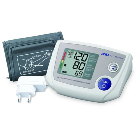 Цифровой автоматический тонометр AND UA-777 для измерения артериального давления и частоты пульса, с манжетой для рук с длиной окружности плеча 22 - 32 см, и сетевым адаптером. Предназначен для применения в качестве индивидуального средства контроля артериального давления и частоты пульса.