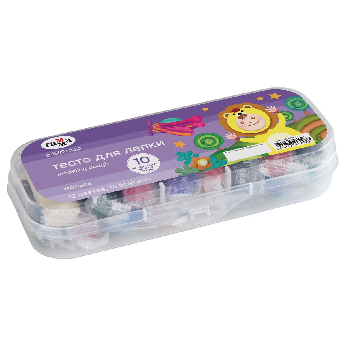 Тесто для лепки Гамма "Малыш", 16 брусков, 12 цветов, 400г, стек, пласт. пенал