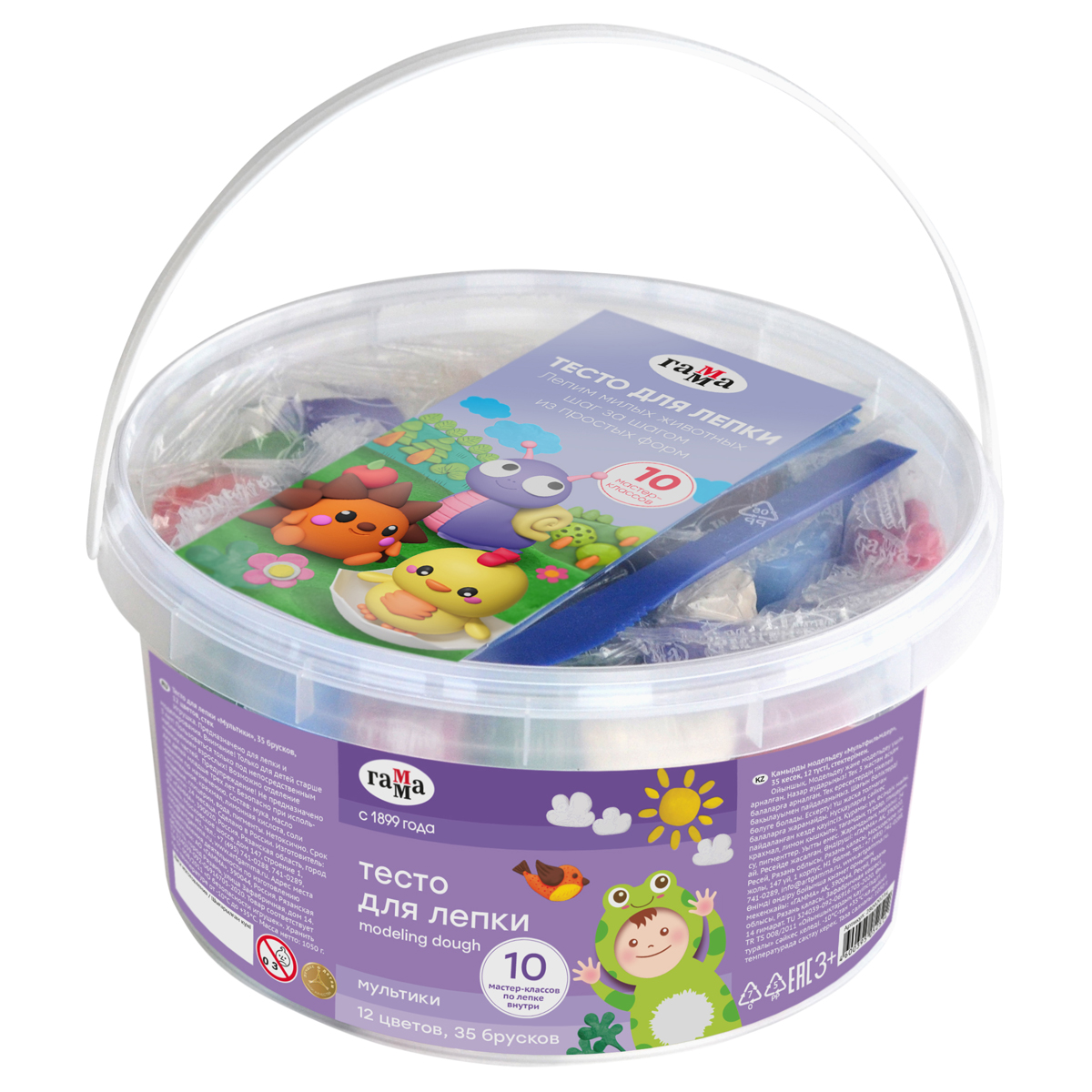 Тесто для лепки Гамма "Малыш", 35 брусков, 12 цветов, 1050г, стек, пластиковое ведро