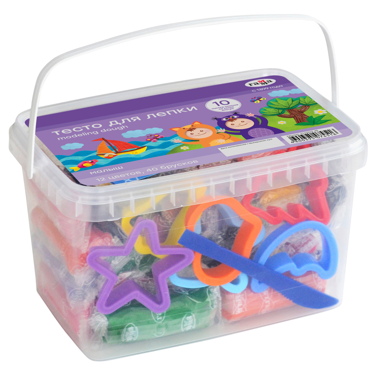 Тесто для лепки Гамма "Малыш", 40 брусков, 12 цветов, 1200г, формочки, стек, пластиковое ведро