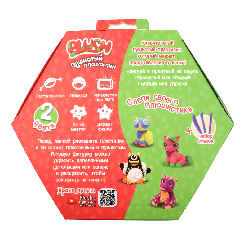Plush – это кинетический пластилин, имеющий уникальный состав. Взяв plush в руки к Вам в ладони попадает настоящее облако, такое невесомое, но при этом очень эластичное. Из него можно лепить любые фигуры от совсем простых до настоящих художественных шедевров и не переживать, что фигуры будут растекаться под собственным весом. Приятным дополнением послужит возможность запекать PLUSH в духовке как глину (запечатлев таким образом творчество ребёнка на разных этапах развития), а еще Plush умеет прыгать как мячик!