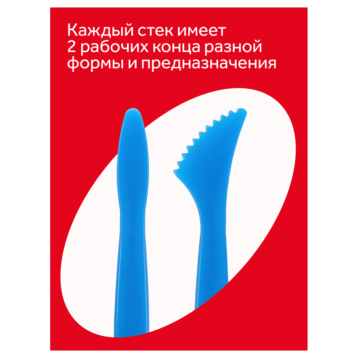 Набор стеков ГАММА предназначен для моделирования при работе с материалами для лепки. В наборе 2 цветных стека из полистирола – синий и красный. Каждый стек имеет 2 рабочих конца разной формы и предназначения. Стеки подходят для более точной проработки мелких деталей, которые сложно сделать пальцами, а также для придания фактуры изделию. Рекомендуются для использования при работе с пластилином, полимерной и любой другой глиной, а также с гипсом и прочими пластичными массами. Набор упакован в яркий пакет с европодвесом.