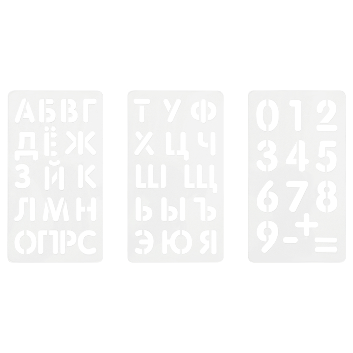 Набор трафаретов состоит из 3 карточек, размером 10*18 см и предназначен для создания надписей, примеров, развития мелкой моторики. Подходят для использования на любых ровных поверхностях.
