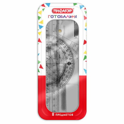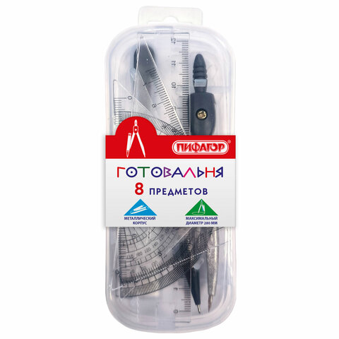 Готовальня ПИФАГОР 8 предметов: циркуль 120 мм, чертежные принадлежности, пластиковый пенал, 210860