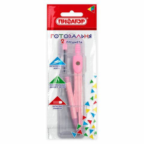 Готовальня ПИФАГОР, 2 предмета: циркуль 120 мм, запасные грифели, пенал, ассорти, 210861