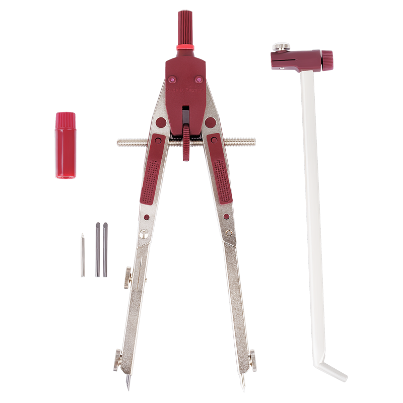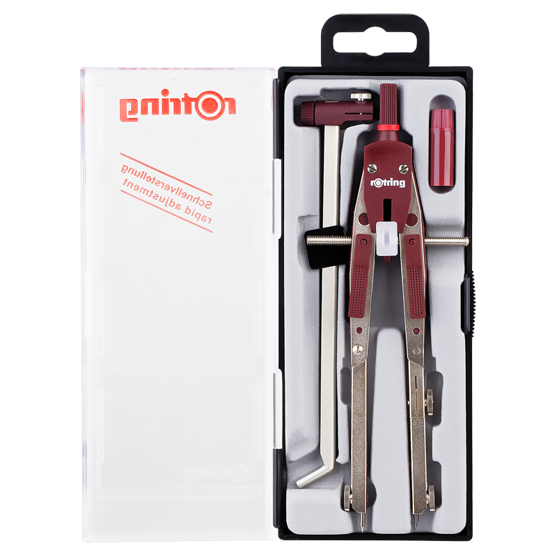 Большой кронциркуль rotring с быстрой регулировкой/ <br/>-Установка различных радиусов с помощью кнопочного механизма;<br/>-Точная регулировка с помощью микрометрического винта;<br/>-Обе ножки с шарниром;<br/>-Ось поворота: 4.0 мм в диаметре;<br/>- Удлинитель;<br/>-Длина циркуля: 170 мм.
