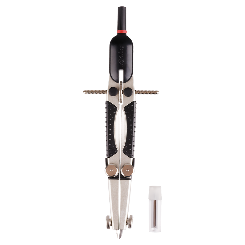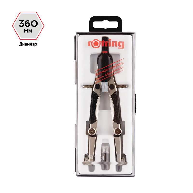 Циркуль rotring быстрой регулировки.<br/>-Быстрая и точная установка радиуса; <br/>-Прочная фиксация микрометрического винта;<br/>-Обе ножки с шарниром;<br/>-Эргономичные пластиковые вставки и углубления для захвата;<br/>-Окружности диаметром до 360 мм;<br/>-Ось поворота: 4.0 мм в диаметре. <br/>- Длина циркуля: 170 мм;<br/>- Упаковка стержней и запасная иголка.