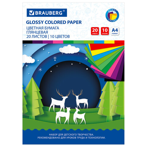 Набор мелованной (глянцевой) односторонней цветной бумаги плотностью 80 г/м2 включает 20 листов формата А4 (200х280 мм) в 10-ти разнообразных и насыщенных однородных цветах. Листы упакованы в картонную папку, легко режутся и сгибаются.