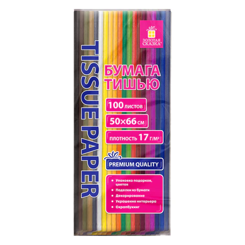 Цветная бумага ТИШЬЮ 17г/м2, 50х66см, 100 листов 20 цветов интенсив ассорти, ЗОЛОТАЯ СКАЗКА, 116496