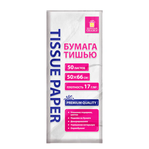Цветная бумага ТИШЬЮ 17г/м2, 50х66см, 50 листов цвет белый, ЗОЛОТАЯ СКАЗКА, 116491