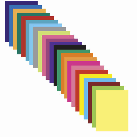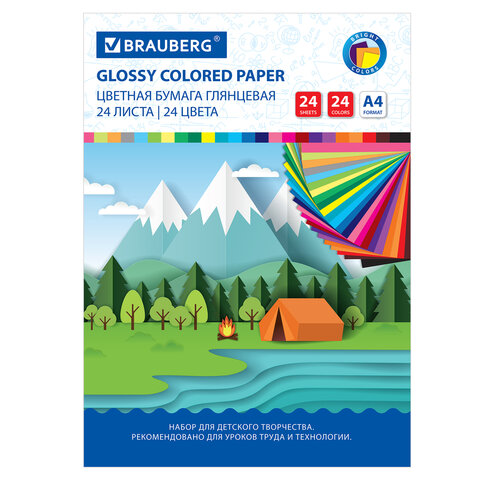 Набор мелованной (глянцевой) односторонней цветной бумаги плотностью 80 г/м2 включает 24 листа формата А4 (200х280 мм) в 24-х разнообразных и насыщенных однородных цветах. Листы скреплены скобами, легко режутся и сгибаются.