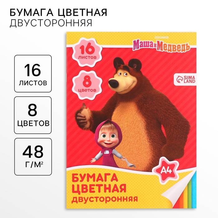 Бумага цветная, А4, 16 листов, 8 цветов, немелованная, двустороняя, на скрепке, 48 г/м², Маша и Медведь